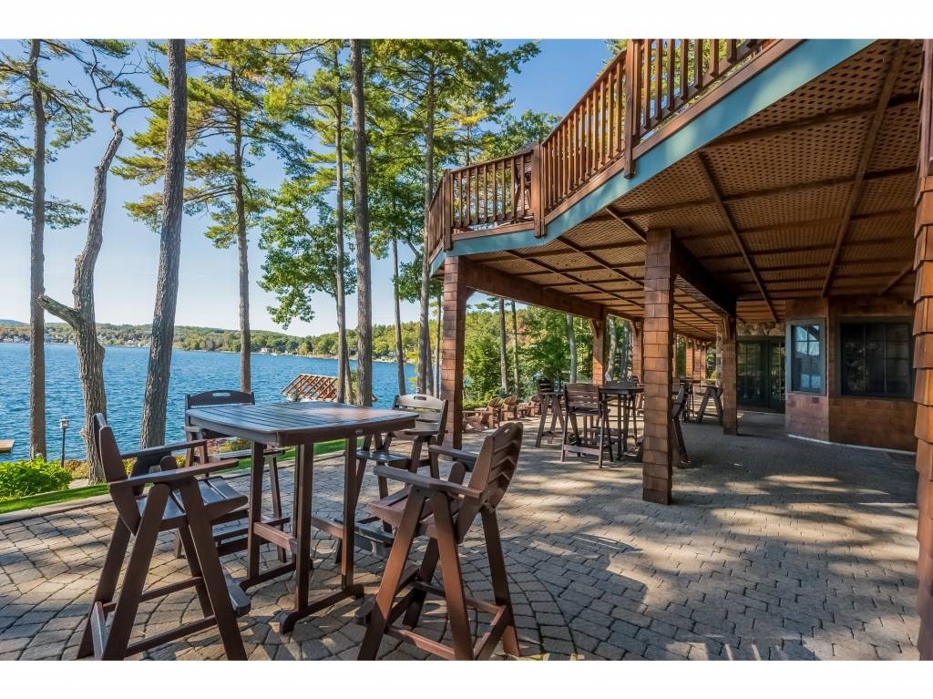 Experience unparalleled sophistication and craftsmanship in this extraordinary & very private Winnipesaukee home, where timeless architecture meets modern luxury. With 204 feet of waterfront and breathtaking, ever-changing sunsets, the property offers picturesque views across Meredith Bay toward Church Landing. The interior boasts soaring ceilings, three stone fireplaces, expansive windows, and gleaming hardwood floors, with sprawling decks and patios, perfect for outdoor seating and dining. Thoughtfully landscaped grounds feature winding walkways that lead to a private covered dock, patios, and a sandy beach. The main level includes a spacious and private master suite with a gas fireplace, tray ceiling, and luxury bath, as well as a stunning great room with a fireplace, a designer's dream kitchen, a casual gathering room, and a charming four-season porch. Upstairs, you'll find three en-suite bedrooms, one of which is a family suite. The walk-out lower level includes two additional bedroom suites, a convenient summer kitchen, and a recreation room/excercise room. This home offers exceptional indoor and outdoor living in a prime location on the Big Lake with a one mile walk to town and all that the beautiful village of Meredith has to offer; restaurants, shopping, a movie theater, a winery with a small concert room and so much more.